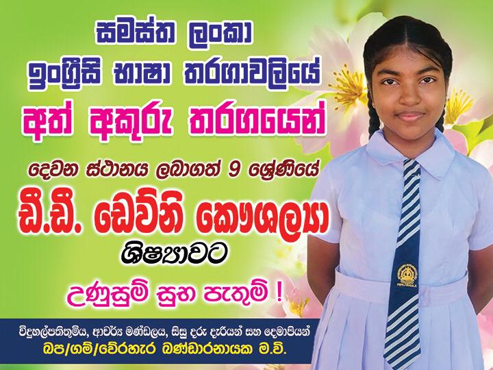 ඉංග්රීසි භාෂා තරඟාවලියේ අත්අකුරු තරඟයෙන් සමස්ත ලංකා දෙවන ස්ථානය 9 ශ්රේණියේ ඩෙව්නි කෞෂල්යා ශිෂ්යාව දිනා ගැනීම
